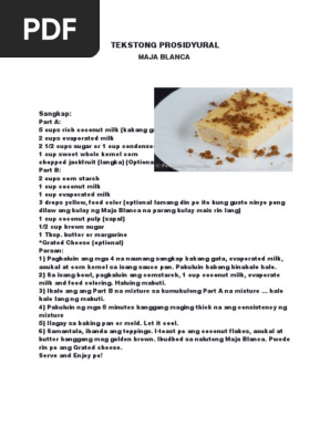 Maipabatid at maipaliwanag ng mabuti ang isang gawain upang maisagawa ito ng maayos at tumpak kaya nararapat lamang ito na maisulat sa paraang mauunawaan ng lahat. Dapat pakaisiping layunin ng tekstong prosidyural na maipaliwanag nang mabuti ang isang gawain upang maisagawa ito nang maayos at tumpak kaya nararapat lamang na maisulat ito sa paraang simple malinaw at mauunawaan ng lahat. Isama sa ginigisa ang baboy na pinakuluan at lagyan ito ng mga pampalasa gaya ng patis toyo suka asin at paminta.