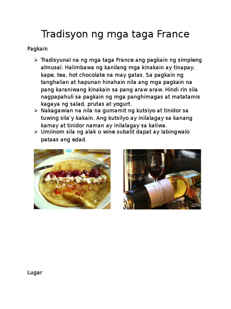 Traditional na pagkain ng taga france. Matinding Pagkakabuklod-buklod ng Mag-anak. French ang pangunahing wika ng 654 milyong mamamayan subalit may iba pang wika ang mga rehiyon. Translations in context of NG MGA TRADISYONAL NA PAGKAIN in tagalog-english.